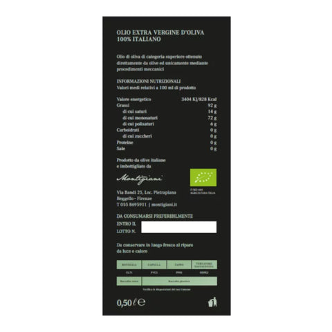 L'Olio Extra Vergine Biologico Montigiani è ottenuto da olive coltivate ad un'altitudine di mezza collina in prossimità del bosco, da appezzamenti dedicati all'agricoltura biologica. Il risultato è un olio dal carattere armonico e dal gusto equilibrato.