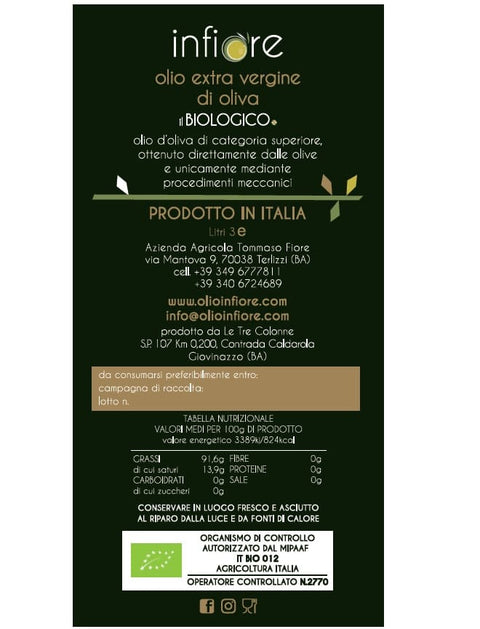 Home/Olio Extravergine Italiano/Olio Extravergine biologico Infiore 3 litri